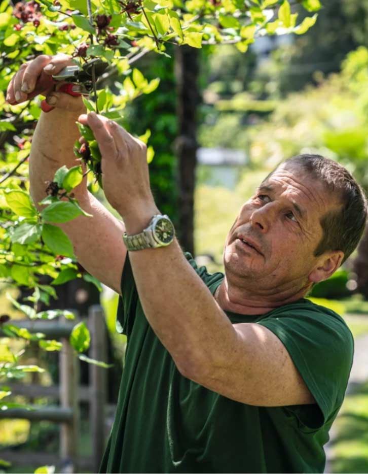 Manche nennen Martin Russenberger den «Indiana Jones der Gärtner», wohl weil er nicht Mühe noch Wildnis scheut, um seltene Pflanzen in ihrem natürlichen Umfeld zu bestaunen. Sicher ist: unser «Urgestein» hat in bald 40 Jahren eine fantastisch reiche Oase erschaffen. Natürlich hat er den «grünen Daumen». Aber für diese Aufgabe braucht es mehr: eine Vision und ein Konzept für den ganzen Park. Martin kennt das Mikroklima jeder Ecke und hat das Gespür, wo welche Art sich wohl fühlt. Mit seinen Pflanzen ist er verbunden, jeden Tag, da gibt es kaum Zeit für Ferien. Der Garten ist sein Leben, hier ist seine Welt, hier umsorgt er mit Herz und Hingabe sein grünes Reich. Und lässt es üppig wachsen, blühen und gedeihen, damit Sie als Gast zu jeder Jahreszeit von Farben verzückt und von Düften umschmeichelt werden. Die Handschrift von Martin prägt auch die weitere Hotelumgebung bis hinauf zum Panoramapool. Seine Schätze entdecken Sie überall.